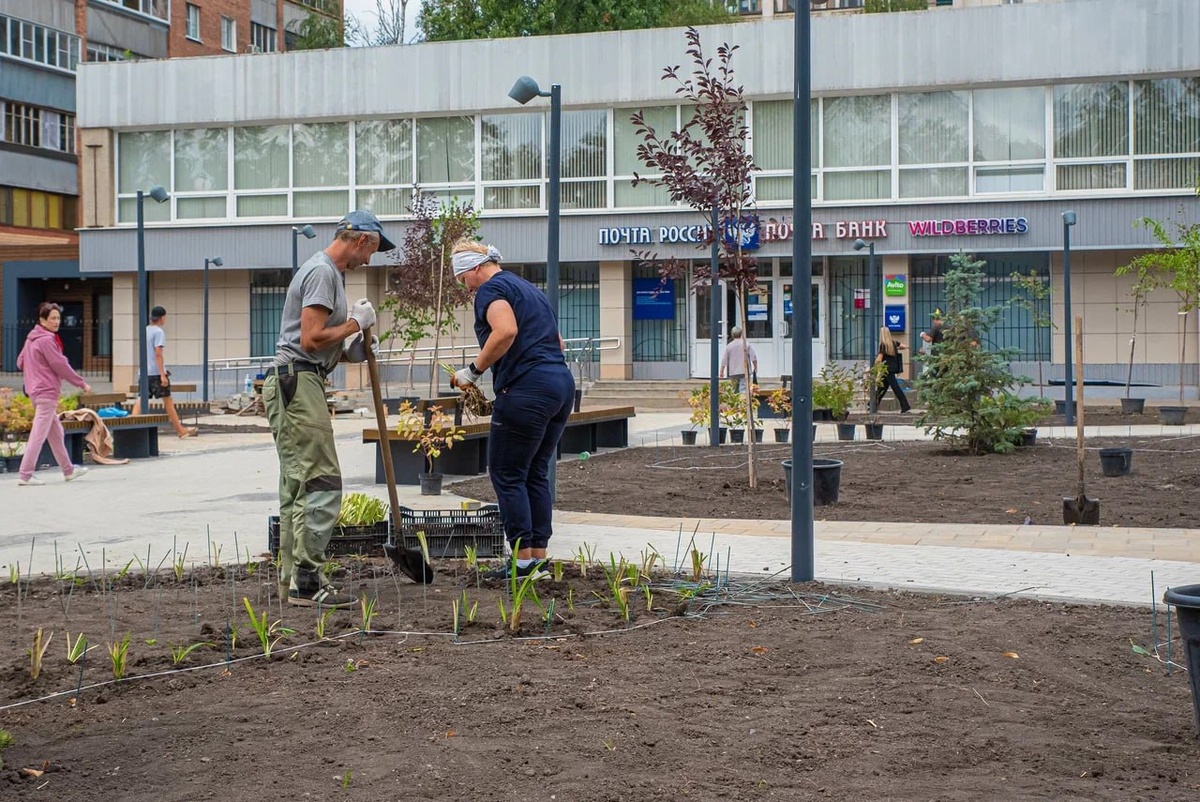В курском сквере на Гагарина высаживают деревья и кустарники