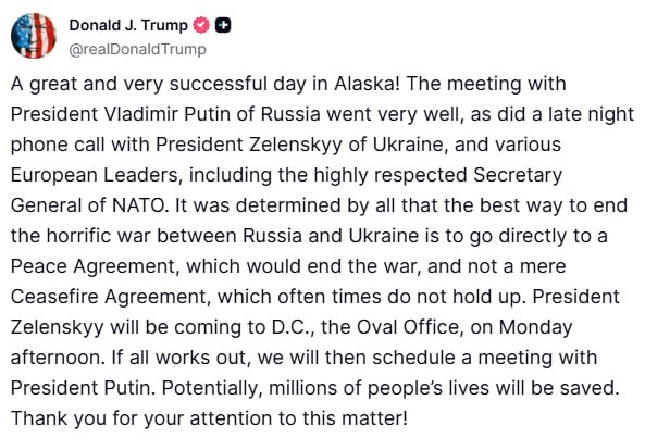 ❗️Trump: GREAT and VERY SUCCESSFUL day in Alaska 'Determined by all' that best bet is STRAIGHT to peace agreement, skipping ceasefire Zelensky talks coming up Monday, hopeful for a Putin-Zelensky meet soon after