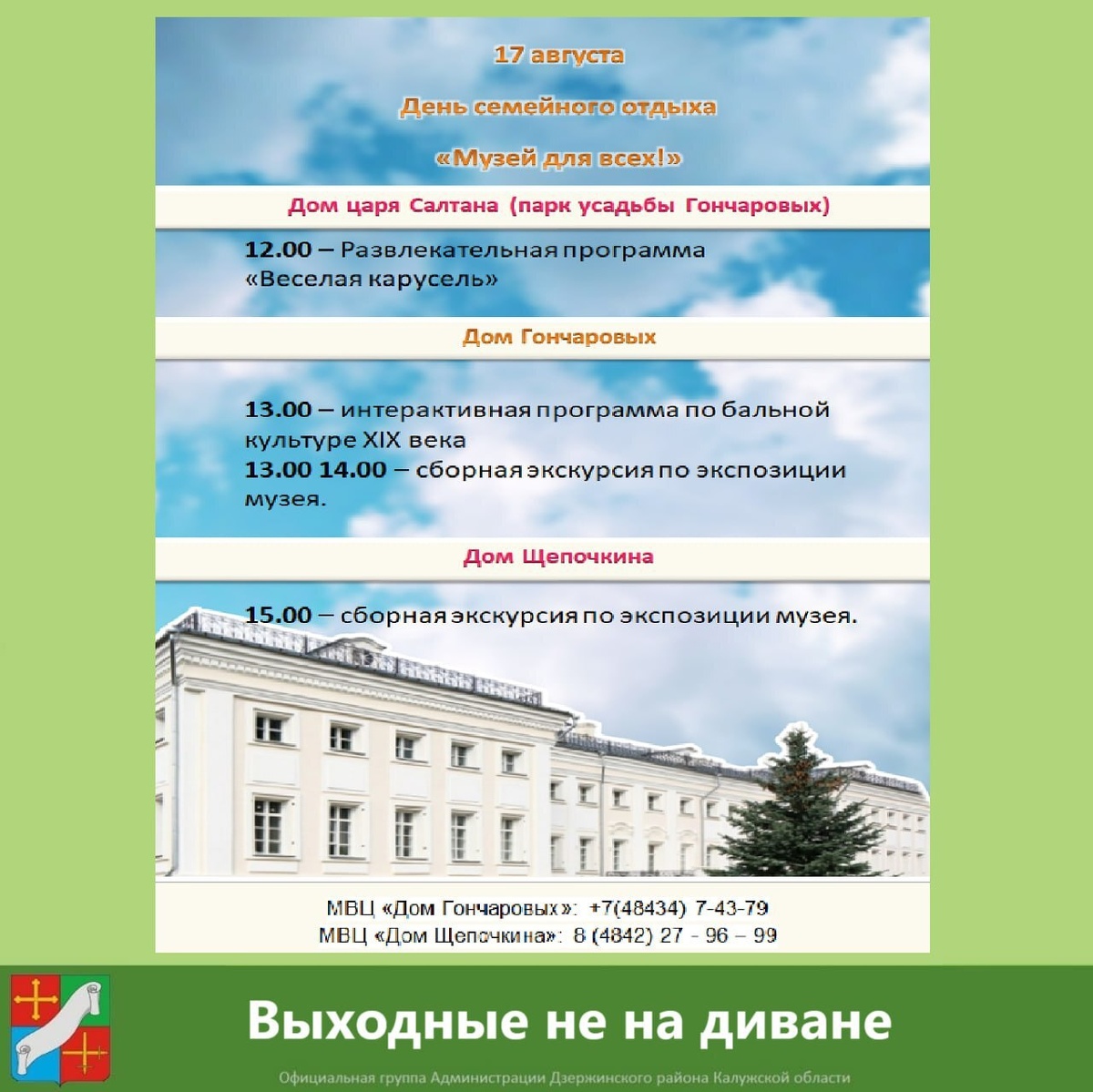 🔸 В воскресенье, 17 августа, музей-заповедник "Полотняный Завод" приглашает на День семейного отдыха. Гостей ждут развлекательная и интерактивная программы и, конечно, экскурсии. Начало в 12.00.