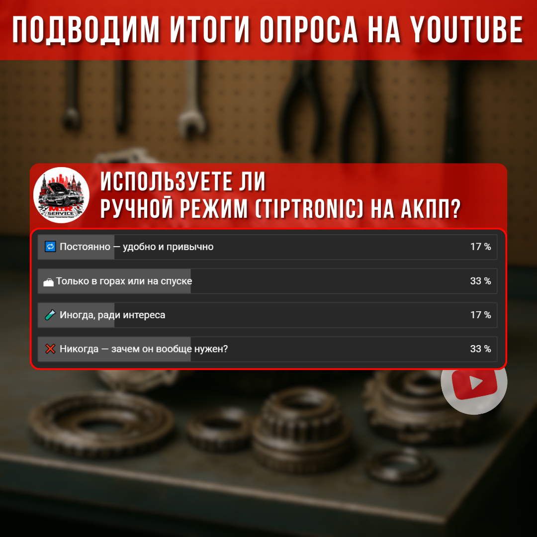 👋🏼 Друзья, на связи MTR Service! Сегодня разберём итоги опроса и объясним, зачем нужен ручной режим. 🚗 Кто им пользуется? По данным опроса, 33% водителей включают Типтроник только в горах или на спуске — это правильно! Ещё 17% применяют его постоянно, а другие 17% пробуют из интереса. Но 33% вообще не понимают его назначения. 🔧 Зачем нужен Типтроник? Этот режим позволяет вручную переключать передачи, не теряя преимуществ АКПП. Например, на крутом подъёме можно зафиксировать пониженную передачу, чтобы двигатель не «захлёбывался», а на спуске — тормозить двигателем, сохраняя тормозные колодки. 🏔 Когда он особенно полезен? В горах или при активной езде. Также он выручает в гололёд: старт со второй передачи снижает пробуксовку. 📢 Пришло время действовать! Если ваш автомобиль с АКПП ведёт себя странно — не ждите поломки. 📝 Записывайтесь на диагностику АКПП! Всегда точная диагностика. ☎️ Пишите в WhatsApp: Wa.me/79958474755