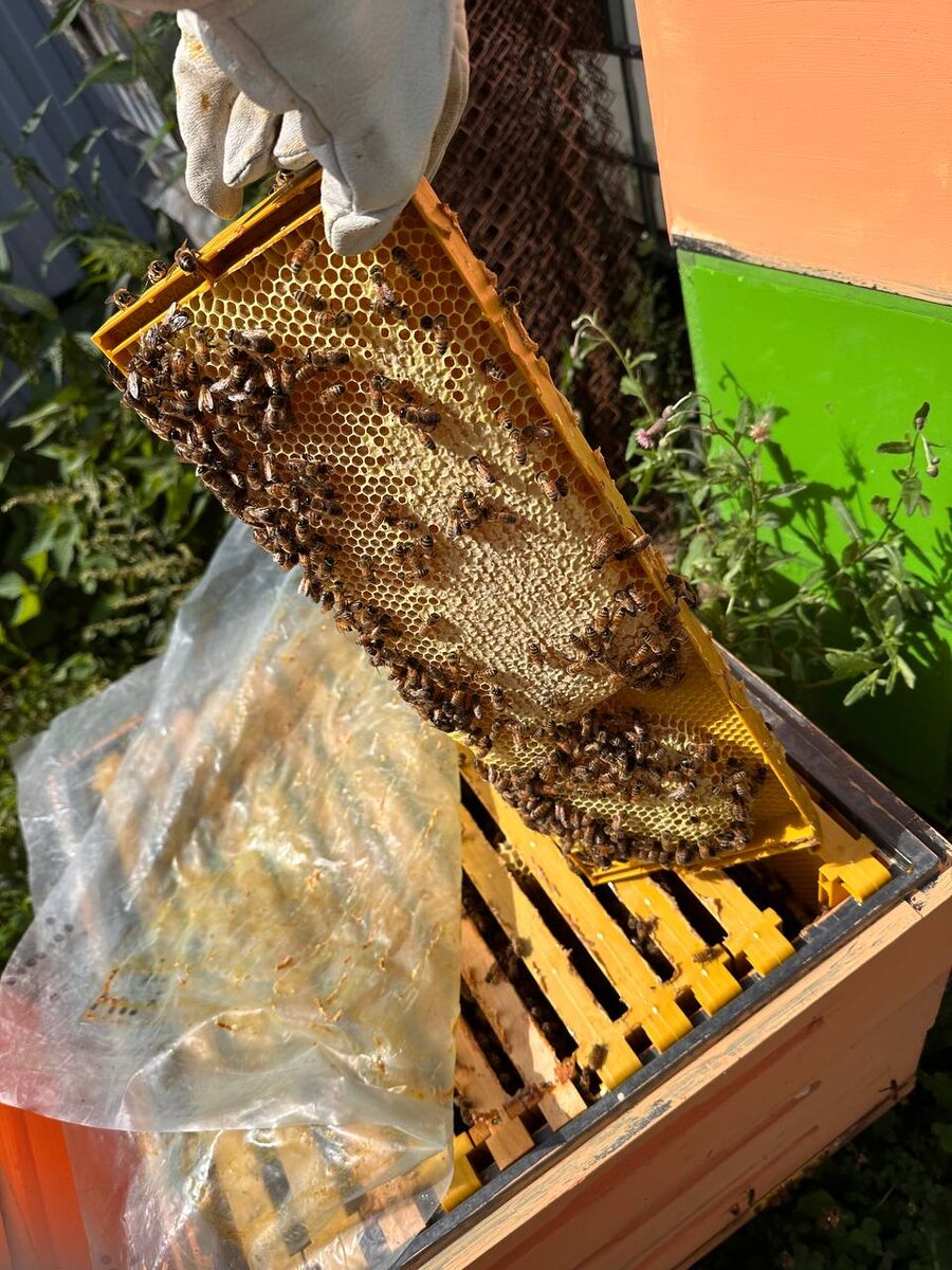 Главная новость - я тоже собрал урожай и неплохой. А это я специально поставил на очень сильную семью эти пластиковые рамки, доставшиеся в подарок на пробу. Ставил совместно с парочкой из дерева с вощиной. Не охотно пчелы идут на них, но справедливости ради я их ничем не обработал, а по американской инструкции ежегодно если не используется новая рамка любого производителя надо обновлять воскпокрытие. Где-то покрытие осталось от предыдущего хозяина, и там результат есть. Но за это время деревянные с простой вощиной и забились и запечатались. Вот такие пироги
