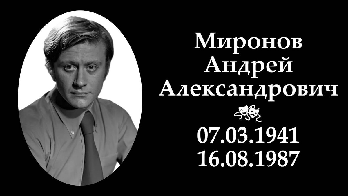"Он ушёл, как истинный артист, будучи до самого конца на сцене... 16 Августа 1987 года оборвалась жизнь выдающегося актёра театра и кино, народного артиста РСФСР Андрея Александровича Миронова. Андрей Миронов родился в семье артистов, тем самым был обречен связать свою жизнь со сценой. Его артистизм, обаяние и жизнелюбие покоряли зрителей с первых ролей в Театре Сатиры, куда он пришел после окончания Щукинского училища. Миронов ворвался в кино стремительно: «Берегись автомобиля», «Бриллиантовая рука», «12 стульев», «Невероятные приключения итальянцев в России» и «Достояние республики» сделали его всенародным любимцем. Он виртуозно сочетал комедию и драму, пел, танцевал, выполнял трюки. Его жизнь не была безоблачной: личные драмы, творческие конфликты, борьба за актуальность в Театре Сатиры и подорванное здоровье. Он ушел на пике славы, прямо на сцене в Риге 14 августа 1987 года, играя Фигаро. Через два дня его не стало. Имя Андрея Миронова навсегда в золотом фонде отечественной культур