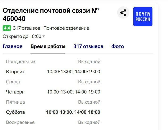 У меня вопрос к 40 отделению связи Почта России по адресу ул.Мира 10. Почему отделение работает всего 3 дня в неделю? Сегодня рабочий день по графику. Пошла получить посылку. Очередь более 20 человек. Работает один специалист: и пенсии выдает, и посылки принимает и выдает. На просьбу пригласить еще специалиста, ответила, что специалистов нет, все уволились, и вообще она одна каждый день без отдыха работает. Через полчаса обед и всех обслужить она не успеет. Ну если нет работников, может стоит объединить почтовые отделения 51 и 40? Я понимаю загруженного специалиста. Но и меня (и не только) тоже понять можно! Я живу не около почты, на дорогу трачу время. Почему я должна несколько раз курсировать к месту получения своей посылки? Не могут выдавать в пункте, пусть разносят по домам.
