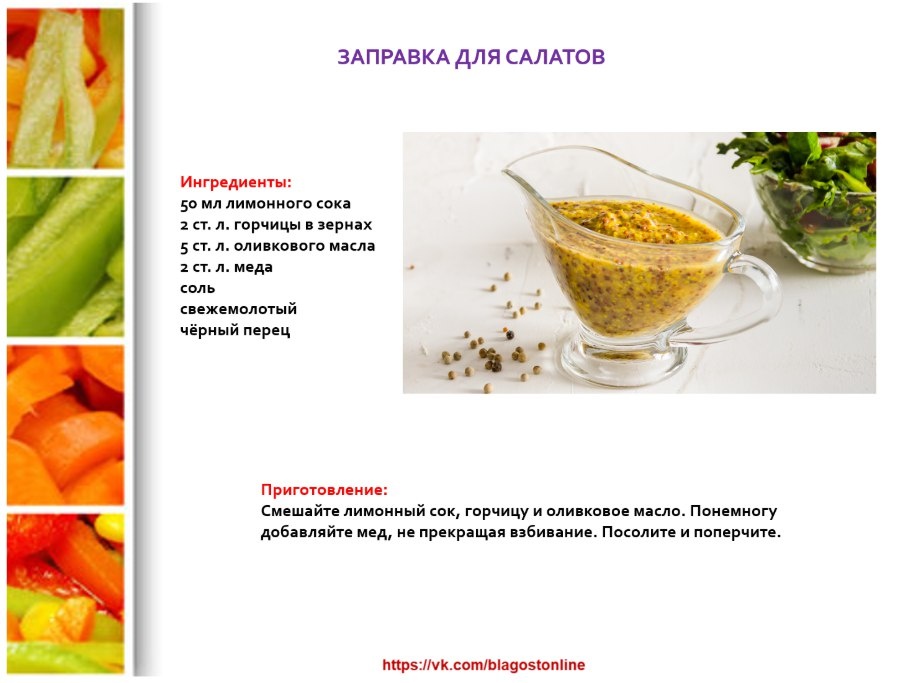 🥗 ЗАПРАВКА ДЛЯ САЛАТОВ 🌀 ИНГРЕДИЕНТЫ 50 мл лимонного сока 2 ст. л. горчицы в зернах 5 ст. л. оливкового масла 2 ст. л. меда соль свежемолотый чёрный перец 🌀 ПРИГОТОВЛЕНИЕ Смешайте лимонный сок, горчицу и оливковое масло. Понемногу добавляйте мед, не прекращая взбивание. Посолите и поперчите.