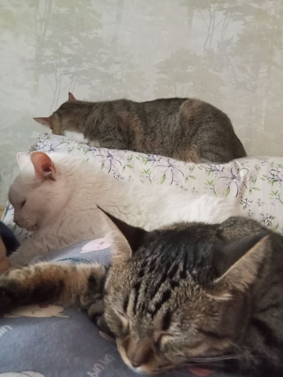 Это я прилегла на диван отдохнуть. А Стеша уже успела клюнуть Мейсона - одной кайфовать мешает. Она у нас такая! Серьёзная дама. Везде порядок наведёт. И о себе напомнит, чтобы про нее не забыли покормить. К миске своей не подпустит никого. Будет такой же молниеносный кусь. Последнее время у нее изменились привычки. Стала забираться на руки при любой возможности. Сейчас даже терпить близкое соседство Мейсона, который тихим сапом оттеснил ее и улегся на мен комфортно. Потихоньку полз полз и заполз. А Мякиш отжал всех 🤣 🤣🤣