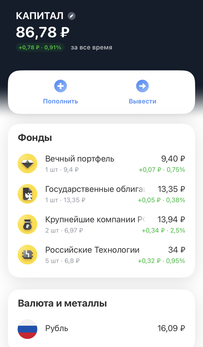 Сегодня - рекордная сумма дохода за все несколько дней моих инвестиций. 😂 И как вы думаете, сколько сегодня утром подкинул Дзен? Целых 14 рублей! И ни в чем себе не отказывать. И не будем. Сразу закинула эту сумму на брокерский, а вот купить ничего не могу. Суббота ведь! Ну что же, подождём до понедельника. Мой мегаскромный крошечный портфель теперь выглядит так: И даже какой-то рост есть.) Я нахожу идею откладывать деньги от Дзен на брокерский не только забавной, но и довольно привлекательной. И мне кажется, это интересный челлендж. Будет интереснее, когда там хотя бы пара тысяч рублей наберется. Тогда уже можно начинать эпопею с акциями и облигациями, купонами и дивидендами. Но когда это будет с такими доходами? 😂 Через год? Или через полгода? Хотя нет, пораньше. Условные 15 рублей в день - это примерно 450 рублей в месяц. За 4 месяца уже будет почти пара тысяч рублей. В общем, к Новому году примерно. Ну что же, ок. Посмотрим, как будет продвигаться дело дальше. И на