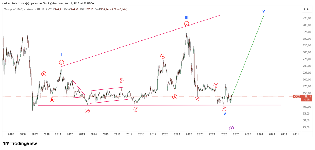 Несколько лет назад я увлекался волновым анализом Эллиотта. Сейчас использую его реже, но иногда всё же смотрю на рынок через эту призму. Для меня это не только инструмент анализа, но и своеобразная тренировка внимательности и логики. Иногда волновая структура работает особенно хорошо на длинных промежутках времени. Именно такие наблюдения могут быть полезны долгосрочным инвесторам, которые предпочитают обходиться без заемных средств и спокойно ждать результат. Сегодня решил рассмотреть бумаги «Газпрома» и то, что может ожидать их в горизонте пяти лет. Текущая картина, на мой взгляд, выглядит довольно оптимистично. Формируется пятая волна в расходящемся диагональном треугольнике, и в рамках этой модели цена может подняться до 450 рублей за акцию. Да, компания остаётся под серьёзными санкциями. Но, несмотря на это, последние события дают основания надеяться на позитивные изменения. Поэтому лично я стараюсь понемногу покупать эти акции и держать их в портфеле. Эту разметку оставляю здесь
