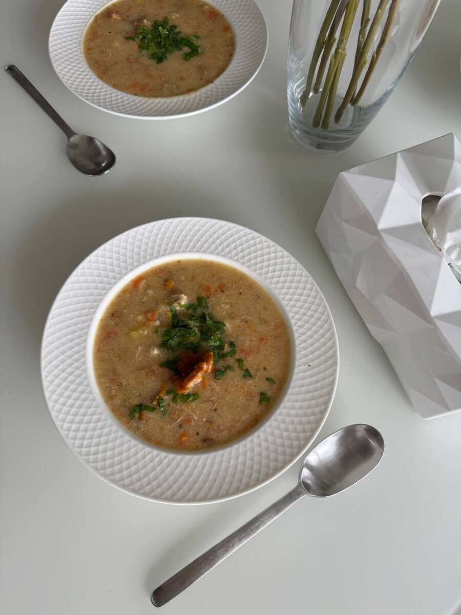 Всем хороших выходных и вкусных красивых блюд 🤗🥰 🍄🟫Суп с лисичками Очень сытный и вкусный! ☝️Для измельчения можно отдельно отложить часть гущи с картофелем , без мяса! .Тогда получится более кремовая текстура. *Рецепт* ((На кастрюлю 5 л) Лук репчатый - 1 шт Морковь - 1 шт Индейка - 400 гр Болгарский перец - 1/2 Чеснок - 3-4 зубчика Картофель - 600 гр Кукуруза (срезанные зерна с початка) - 1 шт Соль, перец,итальянские травы, Лисички - 400 гр Сливки 20% - 200 мл Вода или овощной бульон Петрушка для подачи 🍃