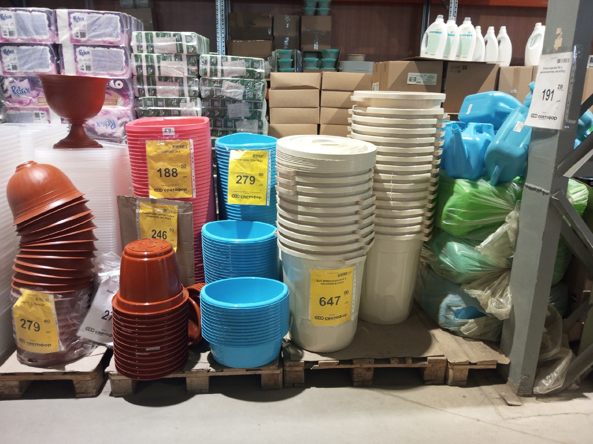 В "Светофоре" я покупала ведра для мусора, несколько складных ведер (это прям здорово выручало, когда квартира была маленькой, а складывать весь этот хоз.инвентарь было некуда), для мамы покупали цветочные горшки, до сих пор в них стоят комнатные растения, хотя прошло уже более двух лет с момента покупки.
