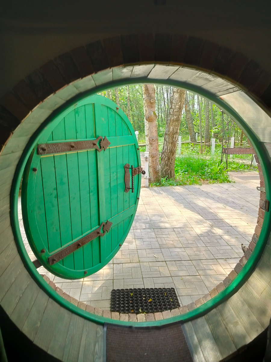В двух часах езды от Москвы, в Можайском районе находится настоящая деревня хоббитов. Вы большой фанат Толкина или просто любите необычный отдых на природе? Тогда добро пожаловать в Хоббитлэнд)! Добраться сюда можно по Минскому шоссе из Москвы или на электричке с Белорусского вокзала. Мы выбрали второй вариант. Время в пути два часа на обычной электричке или час с небольшим на экспрессе. От жд платформы Можайск заказали такси за 400 руб. 15 минут и вот мы у входа в «сказочный мир»). Домики-норы или номер в Хоббит отеле бронируйте лучше заранее. Летом, особенно в выходные, может быть большой наплыв гостей. Мы были в отпуске и поэтому приехали во вторник. На ресепшен нас встретила приветливая девушка-администратор, вкратце рассказала правила нахождения на территории, ответила на интересующие вопросы и вот он заветный ключ от номера хоббит отеля в волшебном лесу подмосковного «Шира») Мы заселились в номер под названием «Домик Охотника Барда». Бронировали номер со всеми удобствами. О