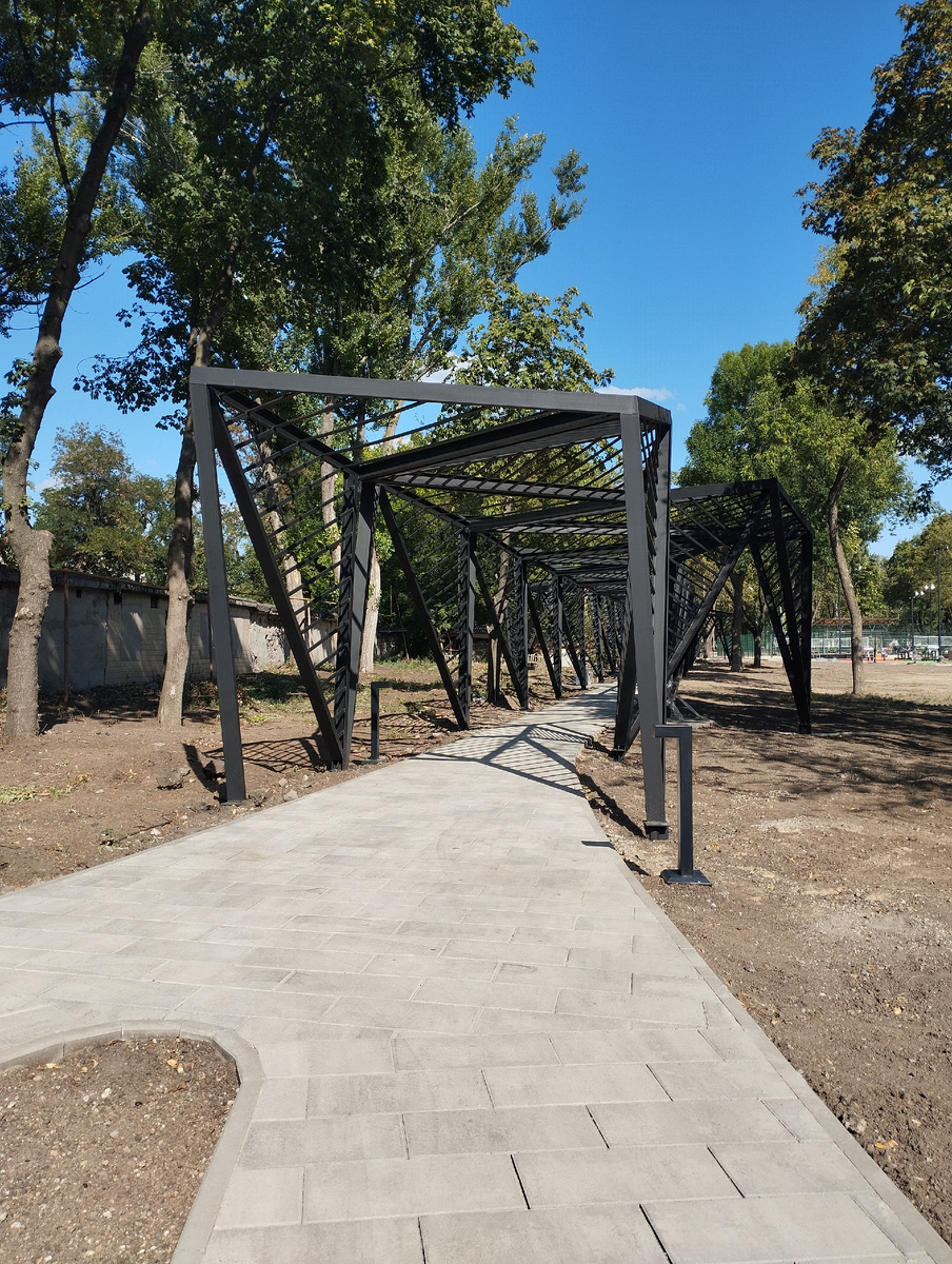 Мне в очередной раз повезло оказаться в этом месте, когда строители убрали некоторые секции временного ограждения. Таким образом могу показать всем читателям моего канала по-настоящему эксклюзивные фото. А как будет выглядеть парк Гулливер после масштабной реконструкции, основную часть которой наши московские шефы согласно высказанному ранее здесь предположению: задумали завершить к Дню шахтёра и Дню города.. А пока посмотрим. На заглавном фото одна из дорожек в верхней части парка, где уже готовы практически все спортивные площадки. Вот они в глубине. Здесь строители качели вешают. Здесь на переднем плане тренажерная площадка. Точнее, одна из тренажерных площадок. Интересно, зачем на земле в нескольких местах в парке установили по кругу маленькие светильники. Что они будут подсвечивать? Это спортивные площадки с очень ярким покрытием. Конечно, снимаю всё издалека, чтобы не мешать строителям. Здесь отличная площадка для пляжного волейбола. Уже сетки натянули. Вот так выглядит ажурный