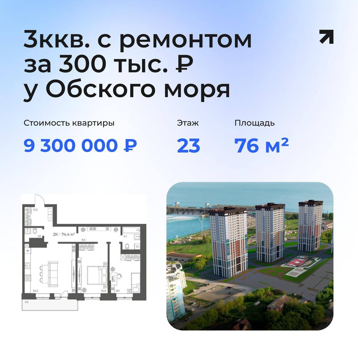 Например, 3ккв. за 9 300 000₽