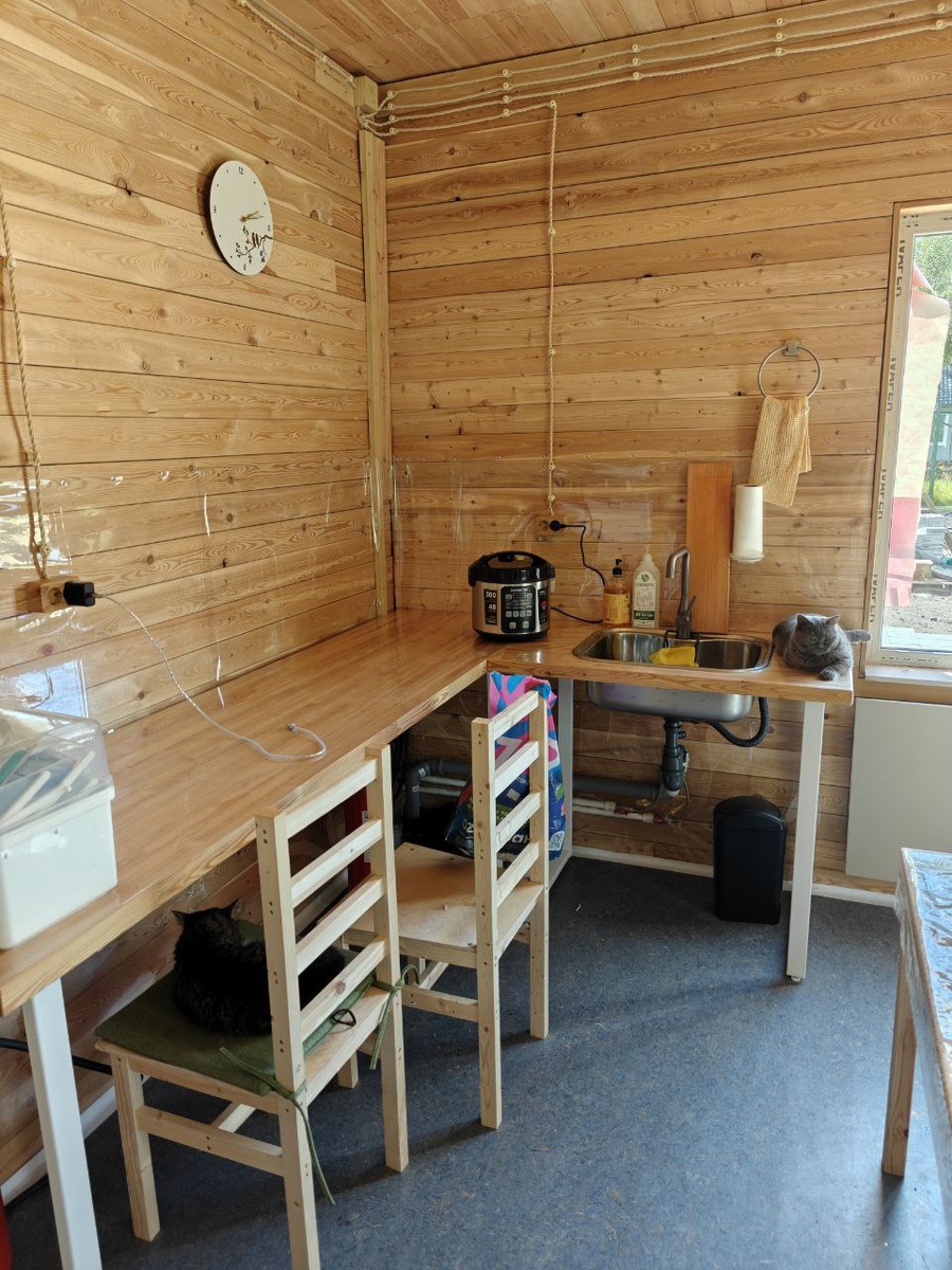 Кухни нет и не будет, так как: 1. Я не готова отдавать 150 000 рублей за кучу шкафчиков. 2. У меня есть огромный самодельный шкаф для всего. 3. Я в принципе не люблю всю эту тему с кухнями, ем мало, для приготовления еды мне достаточно мультиварки и чайника. Посуды у меня очень мало. Ем я очень просто. 4. Все равно везде будет коты. Поэтому мне комфортно все убивать в шкафы Столы сделаны из материалов в озона - панели + подстолья. Все это крепится к стене. Мне очень удобно