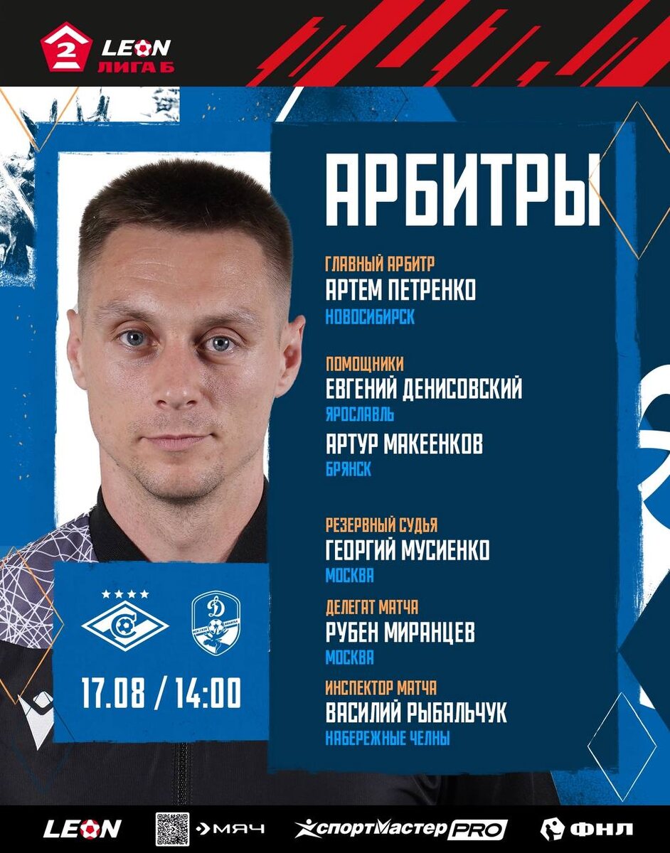⚡Артём Петренко из Новосибирска — главный арбитр матча со «Спартаком-2» Встреча 19-го тура первенства LEON Вторая Лига Б пройдёт 17 августа на стадионе «Спартак» (поле № 4)» в 14:00. Записаться на выезд болельщиков: clck.ru/3Ndqfa 😉 @dynamovologda