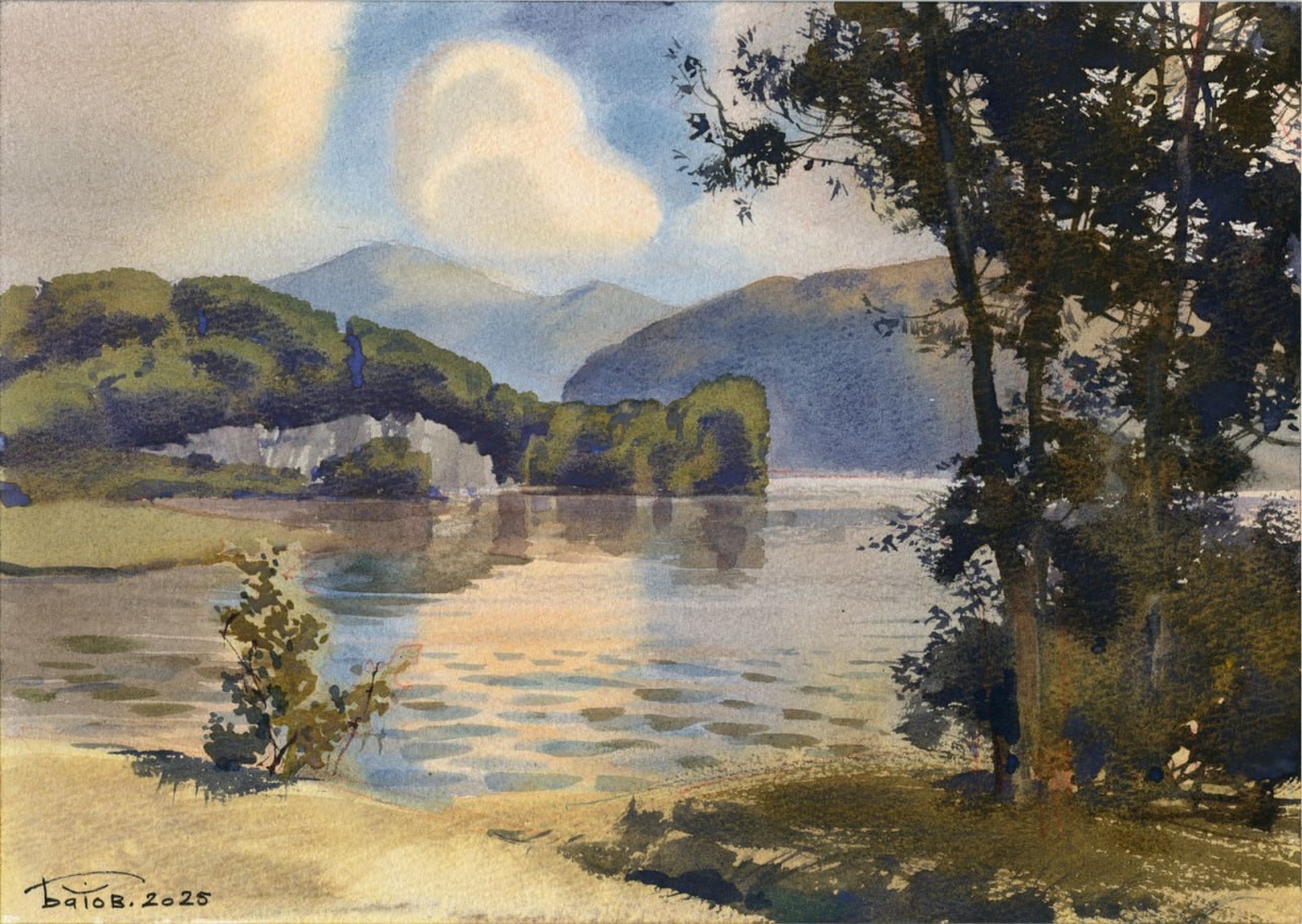 20250812 Мотив с озером / Lakescape / 21x30 см. Конструирование пейзажа. Constructing an imaginary landscape. Краски Pinax Extra. Бумага 100% хлопок Палаццо 300 гр. Акварельные упражнения по вторникам (Москва, Садово-Кудринская 25) "Арт галерея Москва". #акварель #живопись #watercolor #pinax_extra #palazzo_watercolor_paper #Изо #watercolorsketch #ArtBatDiversion #artLesson #мастеркласс