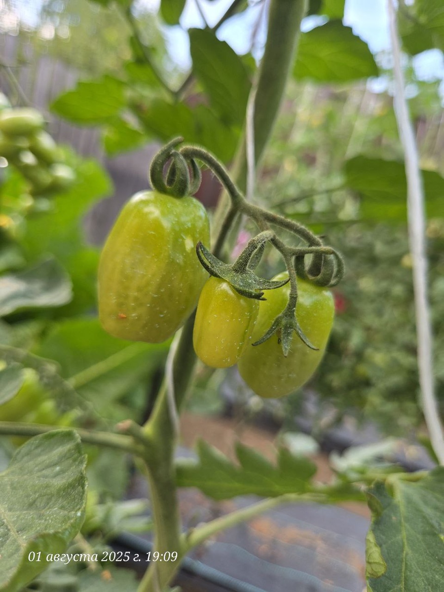 Есть сомнения в том, что у меня именно этот гибрид. По описанию на упаковке производителя (СеДеК) это гибрид должен быть детерминантным до 1 метра. А у меня растет индет, который я завершковала 1 августа примерно на 1,9 метра роста, а может и выше, не измеряла. Это один из самых высоких томатов в нынешнем сезоне. Но плоды как в описании: красные черри овальной формы со сладким вкусом. Только сроки созревания вместо ультрараннего явно ближе к средне-ранним или даже средним.