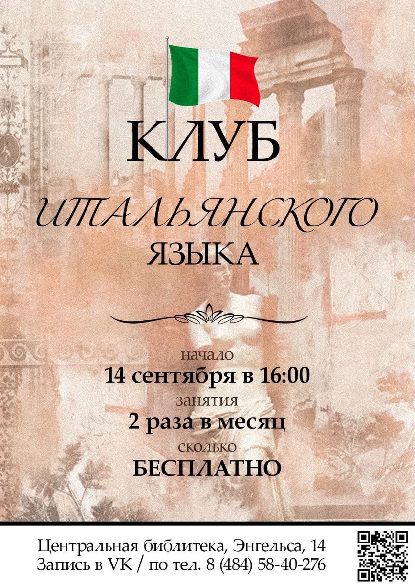 🇮🇹Изучали итальянский язык и не знаете где его практиковать? Приходите в разговорный клуб "Parliamo italiano"! Встречи разговорного клуба не являются уроками. Цель встреч - общение на итальянском языке для поддержания разговорной речи. Не важно, как это у вас получается. Просто говорите! Посещать встречи клуба рекомендуется тем, чей уровень владения языком не ниже А2* *Описание уровня А2: • понимание итальянской речи на темы, связанные с основными сферами жизни; • умение в простых выражениях поговорить об этом, рассказать о себе и своем окружении. Встречаемся 14 сентября, Вск. в читальном зале центральной библиотеки в 16.00. Обсудим удобное для всех время. (18+) 📲Для записи в клуб звоните по телефону +7 (484) 584-02-76. Обнинск, ул. Энгельса, 14. 👍 Подписаться | Ваша реклама