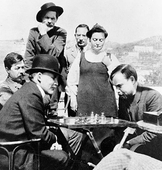 Знаменитое фото: Ленин за партией с давним политическим противником Александром Богдановым – они в гостях у Максима Горького (писатель, тоже обожавший шахматы, наблюдает).