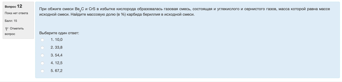 В статье разберу решение задачи №12 из демоверсии за 2024-2025 учебный год. При составлении уравнения, важно обратить внимание, что кислород взят в избытке. При обжиге сульфида хрома(II) получится оксид хрома (III)! Для решения задачи введем переменные, X и Y, так как нет никаких числовых данных. Пусть X моль - это количество вещества карбида бериллия (Be2C) Пусть Y моль-количество вещества сульфида хрома (II) (CrS) Тогда, количество вещества углекислого газа (СO2)- X моль, так как соотношение карбида бериллия и углекислого газа по уравнению, 1:1 Тогда, количество вещества сернистого газа (SO2)-Y моль, так как соотношение сульфида хрома и сернистого газа по уравнению, 1:1 Известно, что масса смеси равна массе газов. Найдем массу по формуле: m=n*M, где n-количество вещества, M- молярная масса вещества. М(Be2C) = 9*2 + 12=30 г/моль M (CO2)= 12 + 16*2=44 г/моль M (CrS)= 52 + 32 = 84 г/моль M (SO2)= 32+ 16*2= 64 г/моль Найдем массы веществ Известно, что масса исходной смеси равна ма