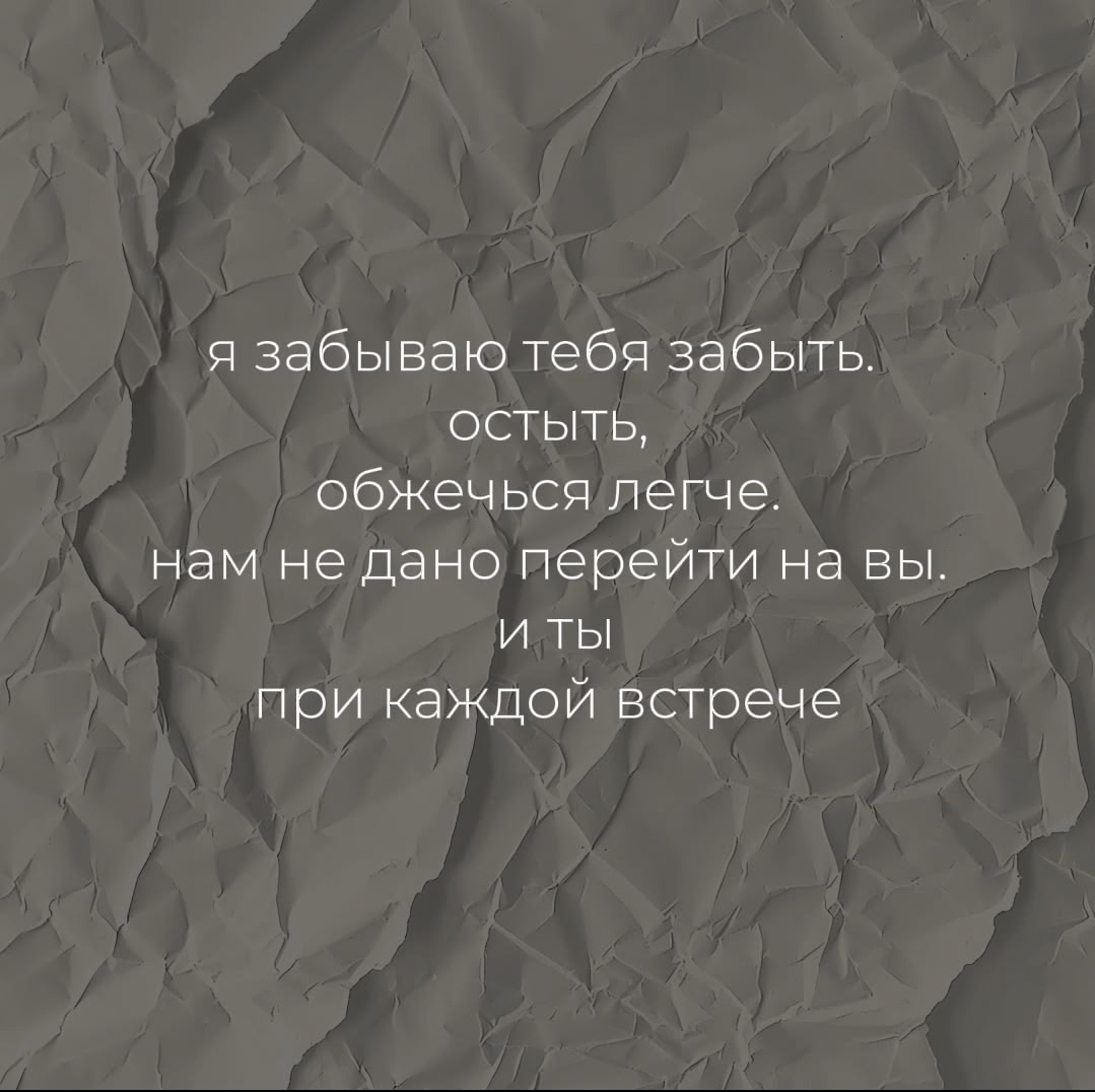 Письмо тому, кого любишь, но никогда не сможешь признаться и отправить строчки, выглядит так: я забываю тебя забыть. остыть, обжечься легче. нам не дано перейти на вы. и ты при каждой встрече прячешься в строчках. сжигай глаголы в них. [не надо спичек] лучше на завтрак касайся слов чужих и без привычек. будет казаться, что слышишь имя – врут часы в прихожей. слово на точка тире две точки* тут не любят тоже. ⠀ * буква Л в азбуке Морзе