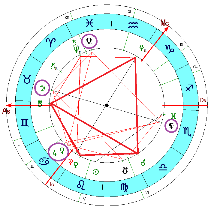 Два паруса. Один складывается из Марса-Урана-Плутона по воздушным Близнецам-Весам-Водолею с вершиной на Меркурии во Льве. И второй, из Юпитер+Венера-Лилит-Раху, по водным Раку-Скорпиону-Рыбам с вершиной на Луне в Тельце.