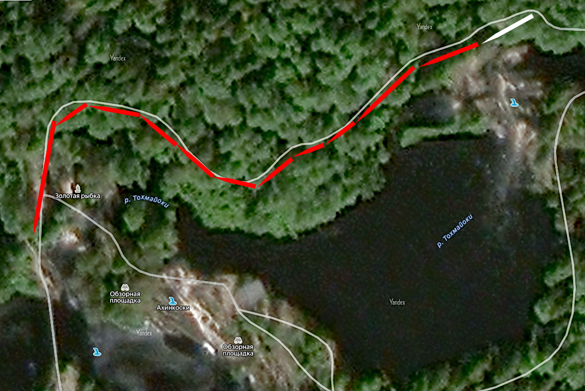 Продолжается наша прогулка по парку «Рускеальские водопады». В предыдущей статье мы переправились с левого берега реки Тохмайоки на правый по одному из мостов, расположенных выше по течению от «северного» водопада. Мосты через Тохмайоки. Вид на водопад с запада, с правого берега реки. Отсюда мы направимся по экотропе вдоль берега вниз по течению реки. С тропы открывается красивый вид в сторону левого берега Тохмайоки. В скале на правом берегу вода «проложила» себе выход к Тохмайоки. «Устье» ручья крупным планом. Задумчивая золотая рыбка на поляне между тропой и рекой. Вид на левый берег Тохмайоки. С тропы можно рассмотреть избу, построенную для фильма «Тёмный мир» на левом берегу реки. Справа от избушки находится подвесной мост над водопадом Ахинкоски, на левом берегу реки видны автостоянка и торговая площадка. Экотропа – удобная, безопасная и живописная. Спокойное течение Тохмайоки перед водопадом. Впереди, ниже по течению, показался мост над рекой. Через полминуты подошли к водопаду