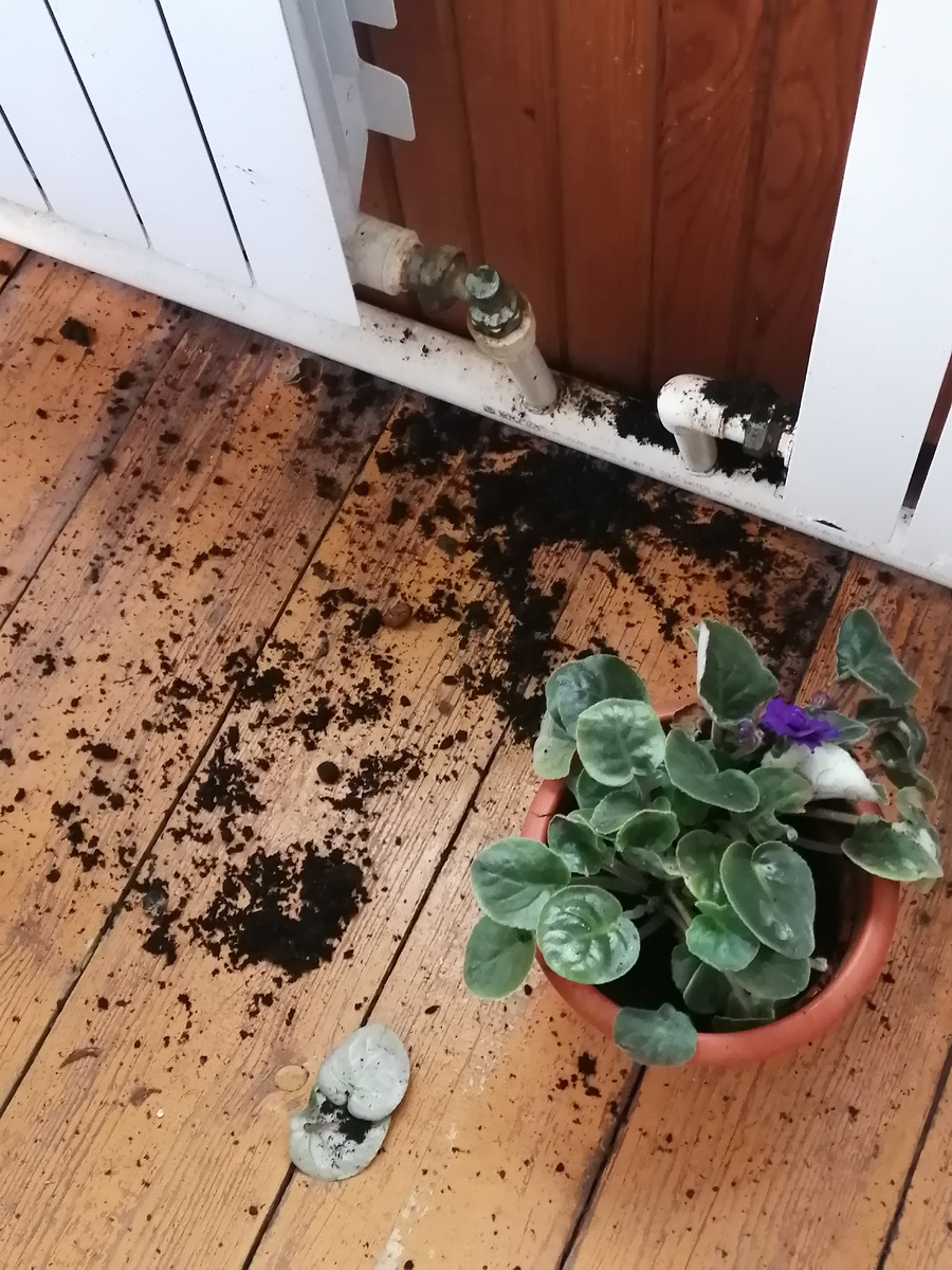 Шкода Муря ухитрилась уронить горшок с фиалкой и ни разу не стесняясь понеслась дальше трепать бедную Шмыгу.