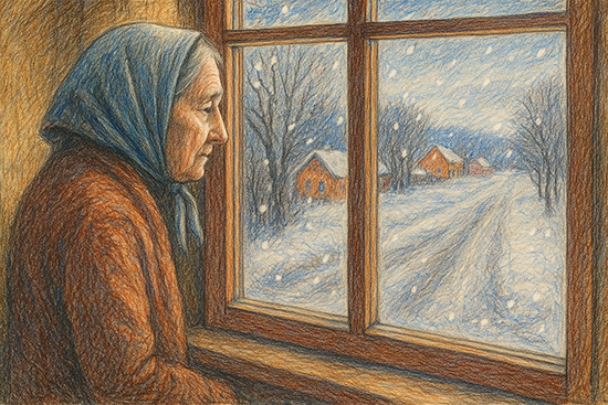 Василиса Петровна стояла у окна и смотрела на пустую дорогу, ведущую к центру деревни. Снег медленно кружил в воздухе, и старая женщина невольно подумала о том, что уже третий месяц никто не приходил к ней в гости.