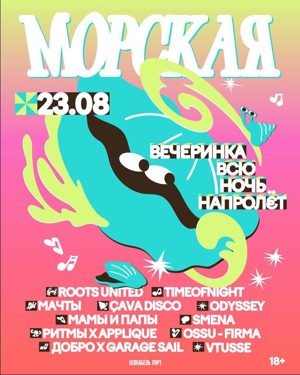 Грандиозная вечеринка «Морская» возвращается! 23 августа вся территория Севкабель порта — от входа до набережной — станет единым пространством, наполненным музыкой. В этом году гостей ожидают 11 сцен, на которых промо-группы представят свои шоукейсы, создавая уникальные музыкальные миры. В одну ночь соберутся более 150 артистов: параллельные сеты, живые выступления, перфомансы и атмосфера, в которой каждый сможет найти свой ритм. Восемь часов непрерывной музыки — с полуночи до утра. Участники: • ROOTS UNITED — авангард электронной сцены Санкт-Петербкрга • SMENA — послы техно • ODYSSEY — мистический хаус с высокими вибрациями и игрой энергий • CAVA DISCO — танцевальная смесь диско, попа и R’n’B • TIMEOFNIGHT — динамичный драм-н-бейс • РИТМЫ x APPLIQUE — яркая коллаборация с московским лейблом • GARAGE SAIL x ДОБРО — Сейл и музыка под одной крышей • VTUSSE — молодые новаторы с байли-фанком и спид-гаражем • OSSU-FIRMA — мелодичные лайвы, которым хочется подпевать • Мамы и Папы — олд-с