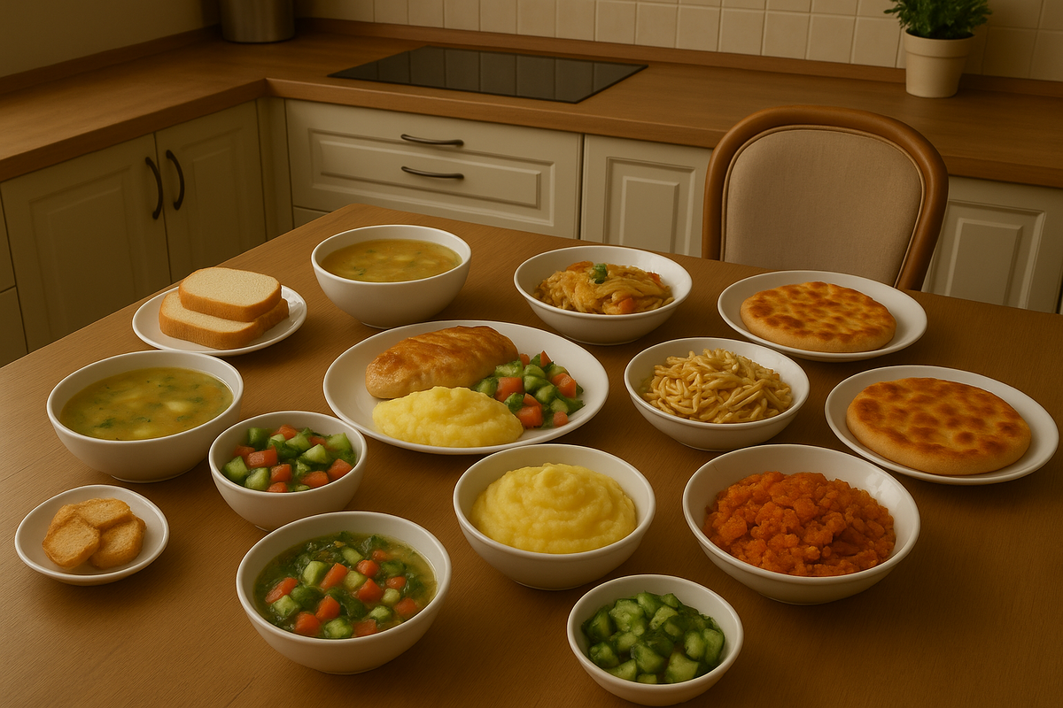 🍽 Обед: Рассольник + хлеб 🍽 Ужин: Куриные котлеты + картофельное пюре + салат из свежих овощей 🍽 Обед: Суп-пюре из кабачка + сухарики 🍽 Ужин: Рыба запечённая с овощами + гречка 🍽 Обед: Борщ + чесночные пампушки 🍽 Ужин: Макароны по-флотски + салат «битые огурцы» 🍽 Обед: Суп куриный с лапшой 🍽 Ужин: Голени в духовке + рис с морковью и луком 🍽 Обед: Уха из хека или минтая + хлеб 🍽 Ужин: Плов с курицей и овощами 🍽 Обед: Окрошка на кефире 🍽 Ужин: Манты + салат «Солнышко» 🍽 Обед: Щи из свежей капусты + сметана 🍽 Ужин: Домашняя пицца + салат из помидоров и огурцов Булочки с корицей, домашний пирог с капустой. Овощной классический (огурец, помидор, лук) «Солнышко» (морковь, яйцо, сыр, майонез) Битые огурцы Курица, рыба, фарш, овощи (картофель, морковь, капуста, огурцы, помидоры), крупы (рис, гречка, пшено, лапша), молочные продукты.
