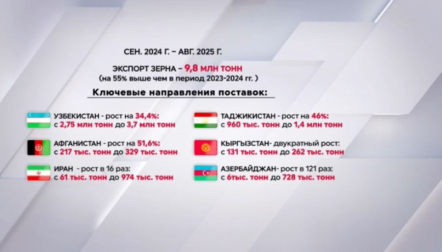 Минсельхоз отмечает существенный рост объёмов поставок зерна, что отражает высокий спрос на казахстанскую пшеницу на внешних рынках, передает «24KZ». Экспорт ее в стране вырос на 55%, сообщает пресс-служба ведомства. По данным «Қазақстан темір жолы», в период с сентября прошлого года по август нынешнего объём поставок составил 9,8 млн тонн. В топ-3 ключевых зерновых направлений вошли Узбекистан, Таджикистан и Афганистан. Увеличился экспорт также в Кыргызстан, Иран и Азербайджан.