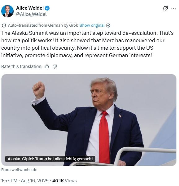 Alaska meeting showed that Merz maneuvered Germany into political obscurity — AfD's Alice Weidel