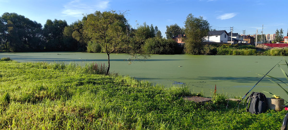С утречка было немного время и решил перед делами заехать на рыбалку ловил с 7ми до 9:40. Целью было всё-таки протестить маховую удочку Dayo Sky Dance,хотя веры в данный водоем у меня не было совсем, а когда приехал и увидел, что он уже полностью покрыт ряской(в прошлое посещение пруд на половину был в тине и водорослях, но такого количества ряски и близко не было), вообще решил, что рыбалка не состоится. Попробовал закинуть-поплавок немного поортачился но всё-таки пробил ряску и занял рабочее положение(все-таки тяжелый поплавок иногда решает).Глубина на дистанции 10-11метров около 1,7 м. Два крючка-размоченные багетные сухарики и червь и еще на всякий пожарный случай припасен тостовый хлеб, что бы на прижим ловить.