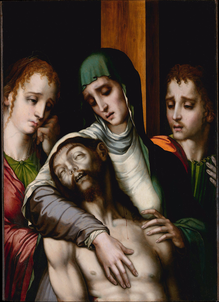 На этом полотне испанский художник Луис де Моралес (1510/11–1586), также известный как “El Divino”, запечатлел в красках пылкие религиозные чувства, выраженные в трудах мистиков Святой Терезы Авильской (1515-1582) и Святого Иоанна Креста (1542-1591), которые помогли определить духовность контрреформационной Испании. Деятельность Моралеса была сосредоточена в городах западной Испании, особенно в Бадахосе, где епископ-реформатор Хуан де Рибера поощрял развитие его образности. Эта картина, относящаяся к одному из самых плодотворных периодов жизни художника, является важным открытием, сделанным недавно. Вероятно, она принадлежала папе Пию VII (умер в 1823 году) и передавалась по наследству в семье Кьярамонти, которые признавали его превосходное качество. Богородица держит на руках истерзанное тело Христа, а святые Иоанн и Магдалина со слезами на глазах наблюдают за ней по бокам. Чёрный фон, прерываемый только деревянным крестом в центре, усиливает проникновенную скорбь изображения. Хот