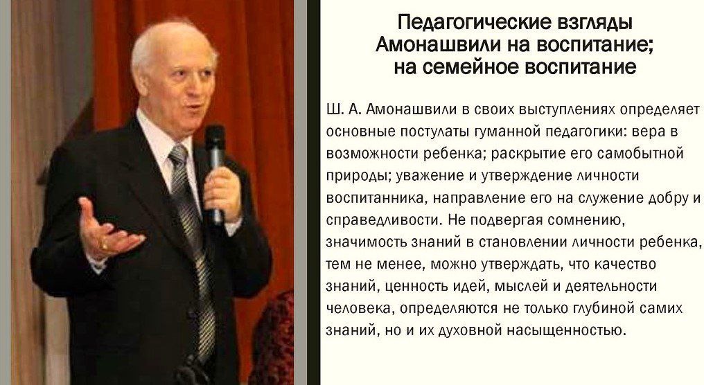 Гуманная педагогика Амонашвили: любовь как метод преподавания Как появилась гуманная педагогика Амонашвили Трудно поверить, но Шалва Александрович Амонашвили — всемирно признанный педагог, автор гуманно-личностного подхода и доктор психологических наук — до седьмого класса был двоечником и не любил учиться. «Причину, которая объясняет это обстоятельство, я бы назвал законом взаимности: я недолюбливал своих учителей, потому что чувствовал — они тоже недолюбливали меня, слабого», — Шалва Амонашвили. Всё изменилось, когда в школу пришла новая учительница грузинского языка. Она не ставила на мальчике клеймо отстающего и не стыдила его перед классом. Вместо этого — отнеслась с теплотой, вниманием и уважением, проявила искренний интерес к его стихам. Через три года Шалва окончил школу с золотой медалью. Во время учёбы в институте он устроился вожатым в пионерлагерь: ставил с детьми спектакли, водил их в походы и постепенно понял, что его п