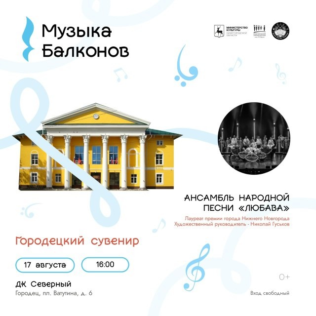 Концертную программу «Городецкий сувенир» для городчан исполнит ансамбль народной песни и танца «Любава» — лауреат международных конкурсов, лауреат Премии города Нижнего Новгорода.