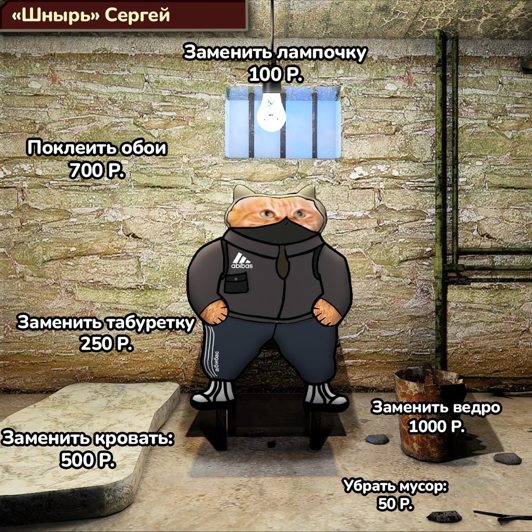 😃 "Тюряга сиблет оффлайн" Так сказать: интерактив-экспериментальный Сергей по кличке Шнырь попал в места не столь отдалённые на долго, так что ему теперь надо обустроить свою камеру (естественно не бесплатно 👿, вещи денег стоят, вы чего? 😑). Если хотите ему помочь, то вот куда можно скинуть деняг (только не забудьте что на что поменять) Boosty - *Тык* Тонады - *Тык* Tribute - *Тык* Личный перевод: Сбер - 2202201133676623; Т-банк - 2200700120848170 На данный момент куплено: 2 Лампочки
