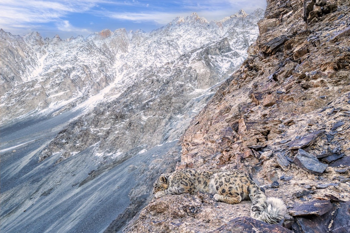 При первом взгляде кажется, что на фото лишь заснеженные горы Каракорума (Пакистан), но, приглядевшись, можно заметить снежного барса, который притаился в ожидании горного барана. Как рассказывает автор снимка Дмитрий Архипов, найти и запечатлеть хищника было большой удачей: съемка велась в экстремальных условиях на высоте 4500 метров над уровнем моря.