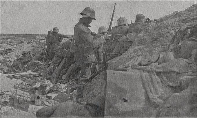 Немецкий штурмовой отряд 27-го пехотного полка в недавно захваченной французской траншее, 16 мая 1917 года.
