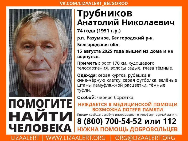 Помогите найти человека! Нуждается в медицинской помощи! Пропал Трубников Анатолий Николаевич, 74 года. 15 августа 2025 года вышел из дома и не вернулся. Если вы обладаете какой-либо информацией о пропавшем, просьба позвонить по номеру 88007005452 (бесплатно по РФ) или 112. ❕ Жесть Белгород - подписаться 📸 Прислать новость: @predlozhka_zhest_bg