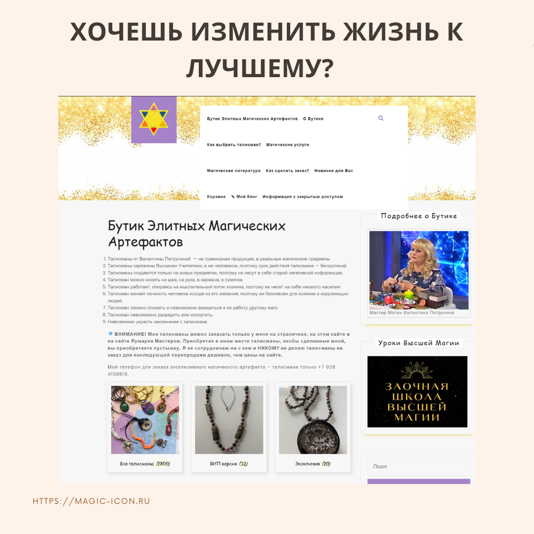 🔮 Привет, искатель чудес! Устал от серой рутины? Хочешь изменить жизнь к лучшему? Добро пожаловать в «Бутик Магических Артефактов» — место, где реальность переплетается с магией! Здесь ты найдёшь: Подлинные магические артефакты, проверенные временем Уникальные магические талисманы ручной работы "Талисманы Силы" Зодиакальных Гениев с их настоящей силой Эксклюзивные украшения ручной работы с магическими свойствами Почему именно Бутик? Каждый артефакт проходит тщательную проверку Все предметы заряжены по особым ритуалам Гарантированная подлинность каждого изделия Персональный подход к каждому клиенту Что ты получишь: Защиту от негатива и порчи Привлечение удачи и успеха Гармонию в отношениях Усиление природной энергетики Не веришь в магию? Приходи и убедись сам! Наши клиенты уже оценили силу наших артефактов. 👉 Переходи на https://magic-icon.ru и открой для себя мир настоящей магии! P.S. А ещё у нас регулярно появляются новинки и проводятся специальные акции. Не упусти свой шанс измени