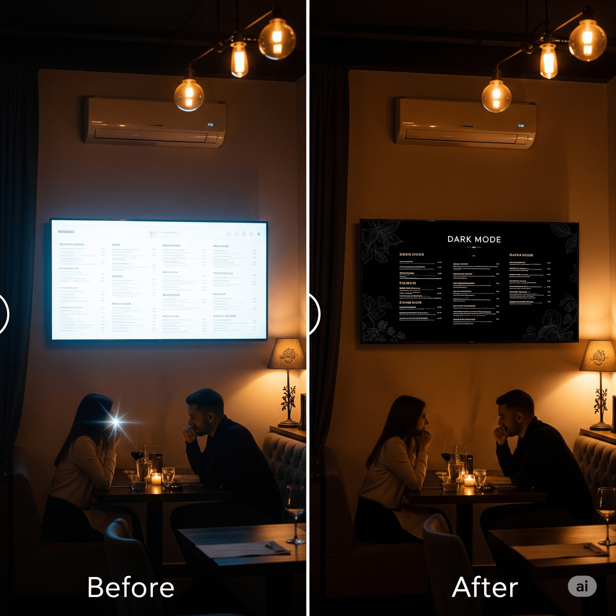 Представьте: вечер, в вашем кафе идеальная атмосфера для свидания или спокойных посиделок. Приглушенный свет, горят свечи, играет тихая музыка... И посреди всего этого великолепия на стене висит огромный светящийся прямоугольник, который слепит гостей, как автомобильные фары! Знакомая ситуация? Многие владельцы кафе, установив цифровое меню на телевизоре, совершают одну и ту же ошибку: используют один и тот же яркий, дневной дизайн круглосуточно. В чем проблема? Днем, когда в зале светло, яркое меню с белым фоном смотрится отлично. Но вечером, когда основное освещение приглушается, такой экран становится главным визуальным раздражителем. Как это исправить за 1 минуту? Решение до смешного простое — использовать «ночную» или «темную» тему для вашего меню. Современные сервисы для цифровых меню позволяют менять темы оформления буквально в два клика. Вы можете делать это вручную каждый вечер или даже настроить автоматическое переключение по времени. Не позволяйте такой мелочи портить впеча