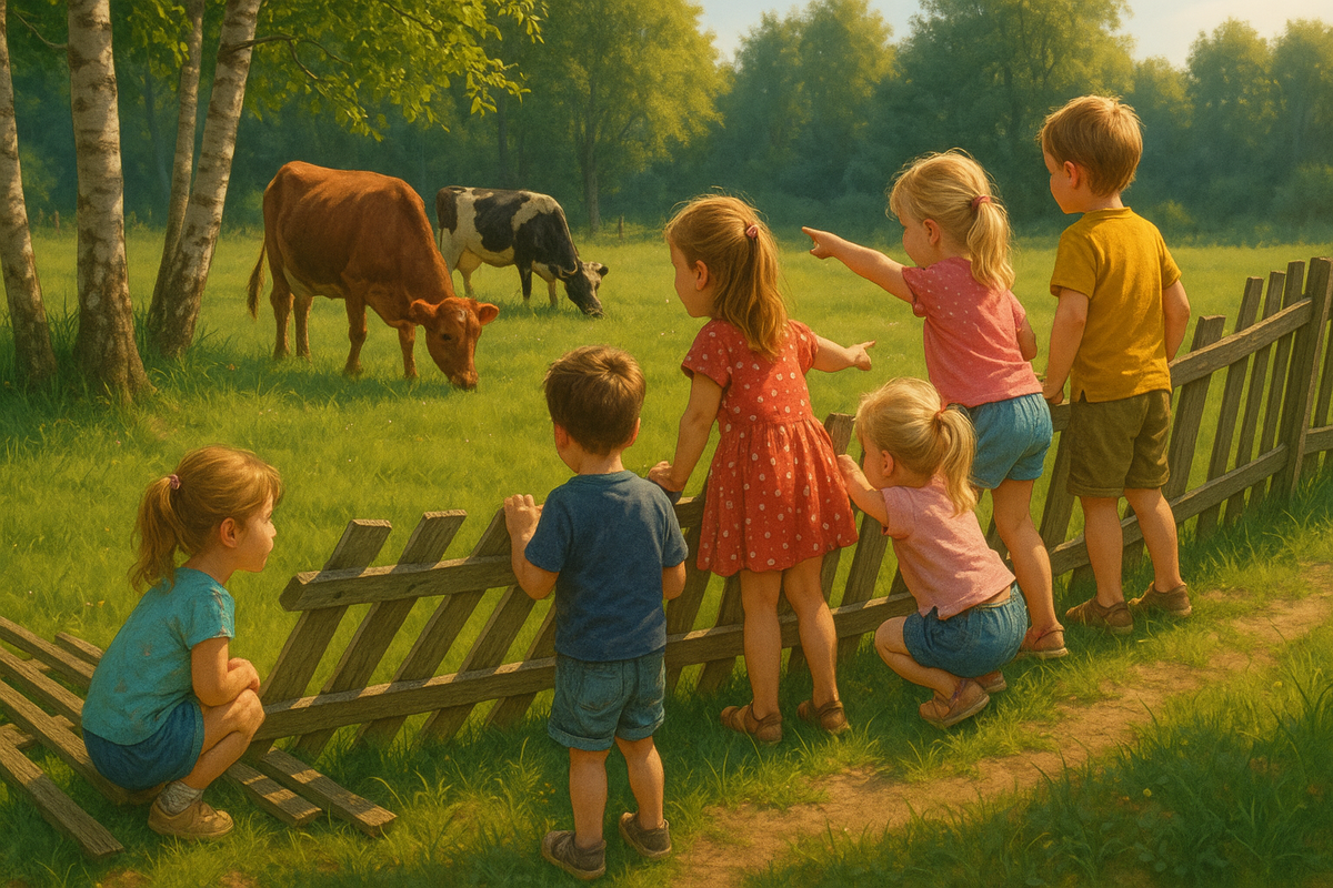 Историей поделилась Настя Когда я была маленькой, года четыре, ну, может, лет пять, я ходила в детский сад. Он стоял в посёлке, в самой гуще березовой рощи, деревянный, тёплый, как бабушкина избушка. Сад был обнесён заборчиком из штакетника: невысоким, посеревшим от дождей, но всё ещё бодро стоящим на своём посту. Была середина лета, и село жило своей жизнью. Коровы, гуляющие рядом, были как фон, они всегда где-то были. Но в тот день… в тот день я будто впервые их увидела. Может, они были особенно красивыми. Или особенно важными. Или просто я была особенно внимательной. Я позвала всех детей: