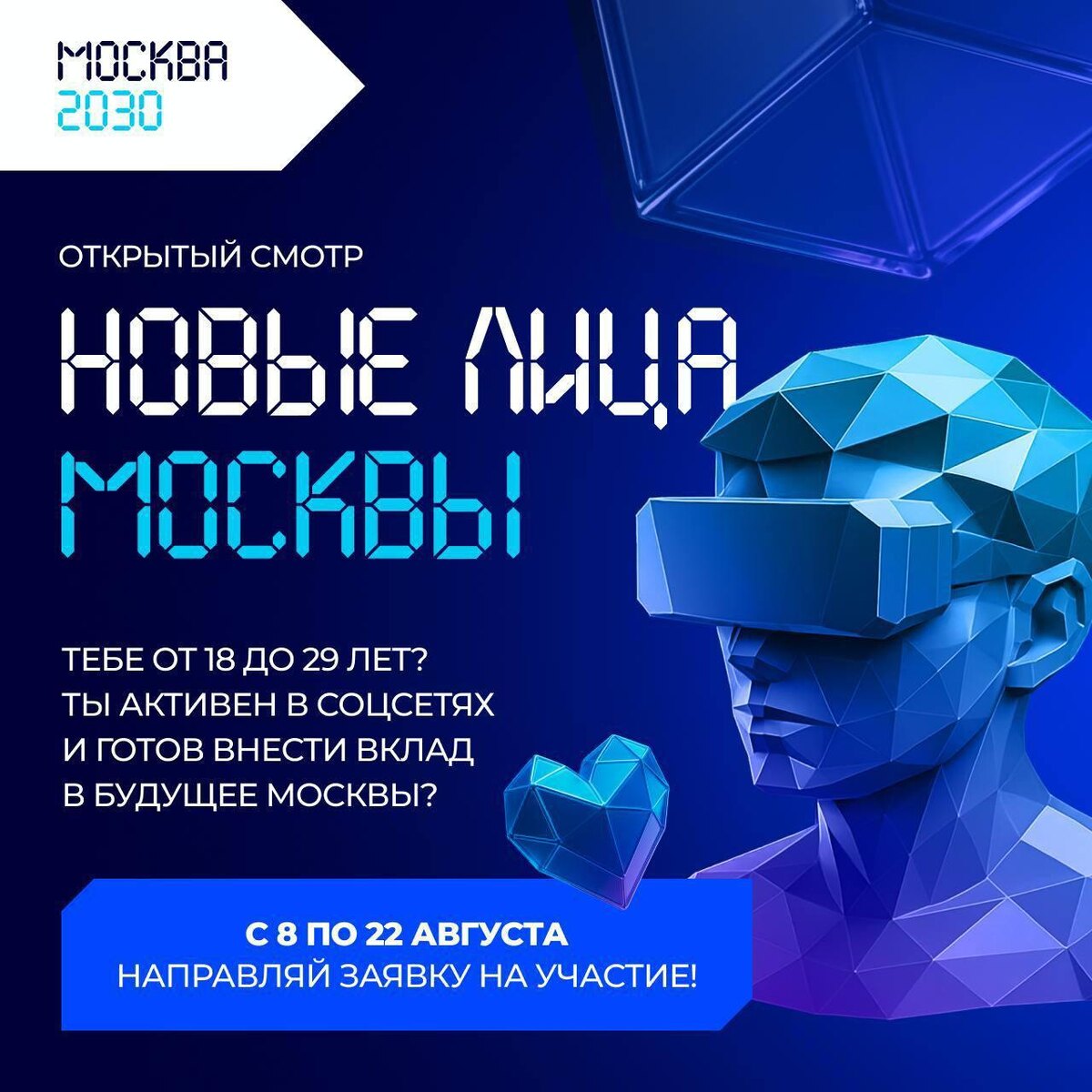 В рамках форума «Территория будущего. Москва 2030» проходит специальный смотр «Новые лица Москвы». Основная задача спецпроекта — создание сообщества активных, мыслящих и способных стать «голосом поколения» мегаполиса. Список из 100 участников смотра «Новые лица Москвы» в возрасте от 18 до 29 лет будет сформирован экспертным советом и представлен 1 сентября. Они станут амбассадорами Москвы будущего, получат уникальный опыт, возможность общаться с экспертами и представить свои идеи широкой аудитории. До 22 августа претенденты могут подавать свои заявки, подробную информацию о смотре и условиях участия можно посмотреть на сайте.