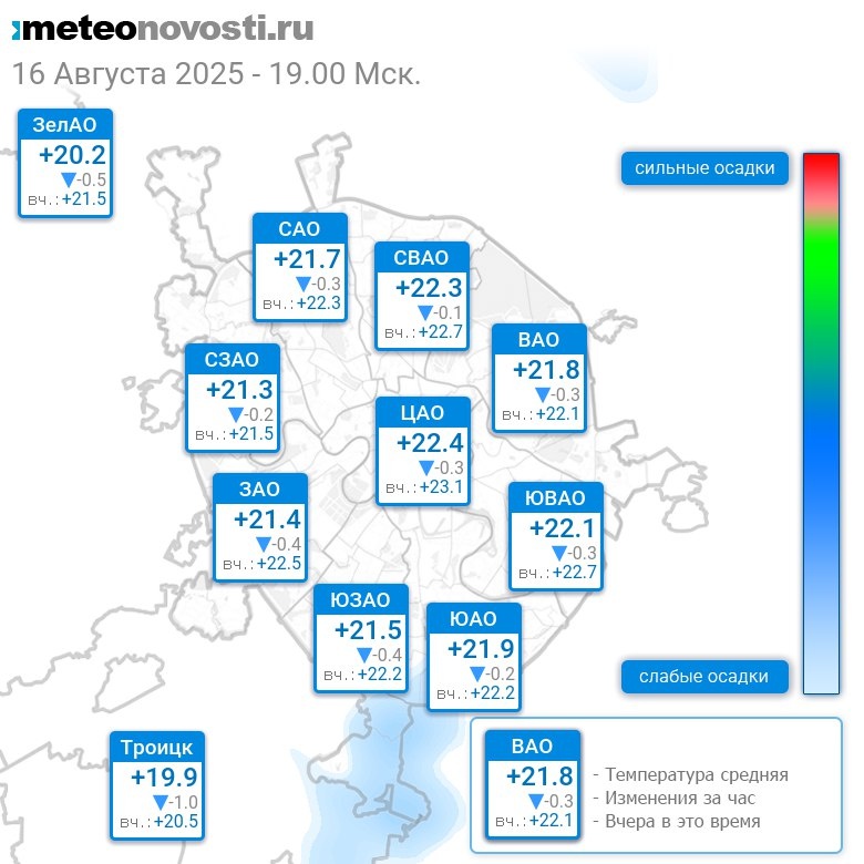 В 19:00 в Москве было от +19.8°C до +22.7°C, средняя температура +21.7°C #погода #Москва #лето #температура #16августа #суббота