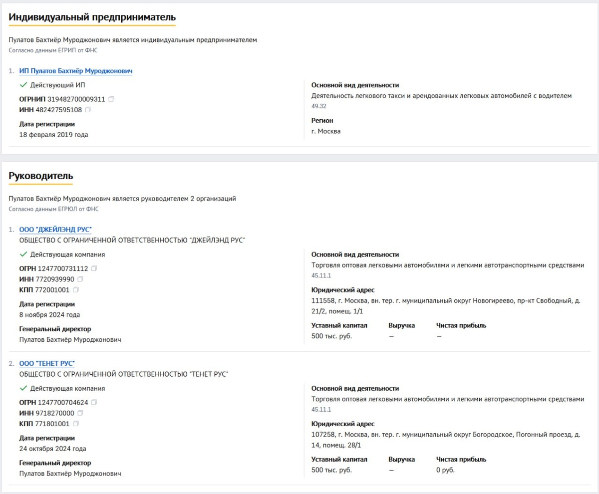 Вот так едете вы с таксистом Бахтиёром Пулатовым на стареньком Hyundai Soalris в Подмосковье, он привычно говорит: "Да я на самом деле не таксист, у меня бизнес есть". Вы, конечно, не верите. А зря. Бывает 😎 Спасибо за серфинг по Сети нашему партнеру Руслану ЛАТЫПОВУ, руководителю компании «Комета-Авто». У него есть не только пресловутые каталоги запчастей, но и, кажется, абсолютно все каталоги по автомобильной теме. Впрочем, выйти на Бахтиёра Муроджоновича теперь совсем не трудно - его фамилия значится в разделах "Правовая информация" сразу на двух сайтах - и Chery, и Tenet. Он еще и руководитель в "Джейлэнд Рус", но сайта марки Jeland мы пока в Сети не увидели. 🇨🇳🇷🇺 #chery #tenet ❗️❗️❗️ Наш сайт | Канал "Только новости" | Канал "Только видео" | Казахстан