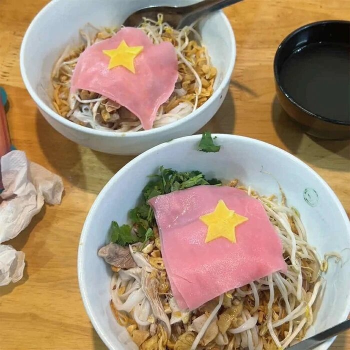 Фуд-декор сделан из той же рисовой лапши, только подкрашенной в цвета вьетнамского флага. Повара вручную вырезают "полотнище" флага и "пятиконечную звезду" и украшают от чистого сердца каждую тарелку.