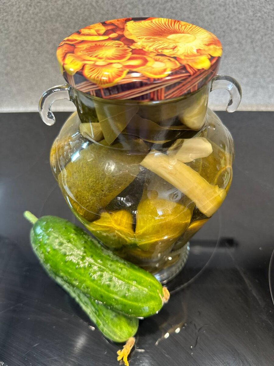 Храните в прохладном месте. Огурцы готовы через 5 дней, но лучше подождать 2 недели для насыщенного вкуса.