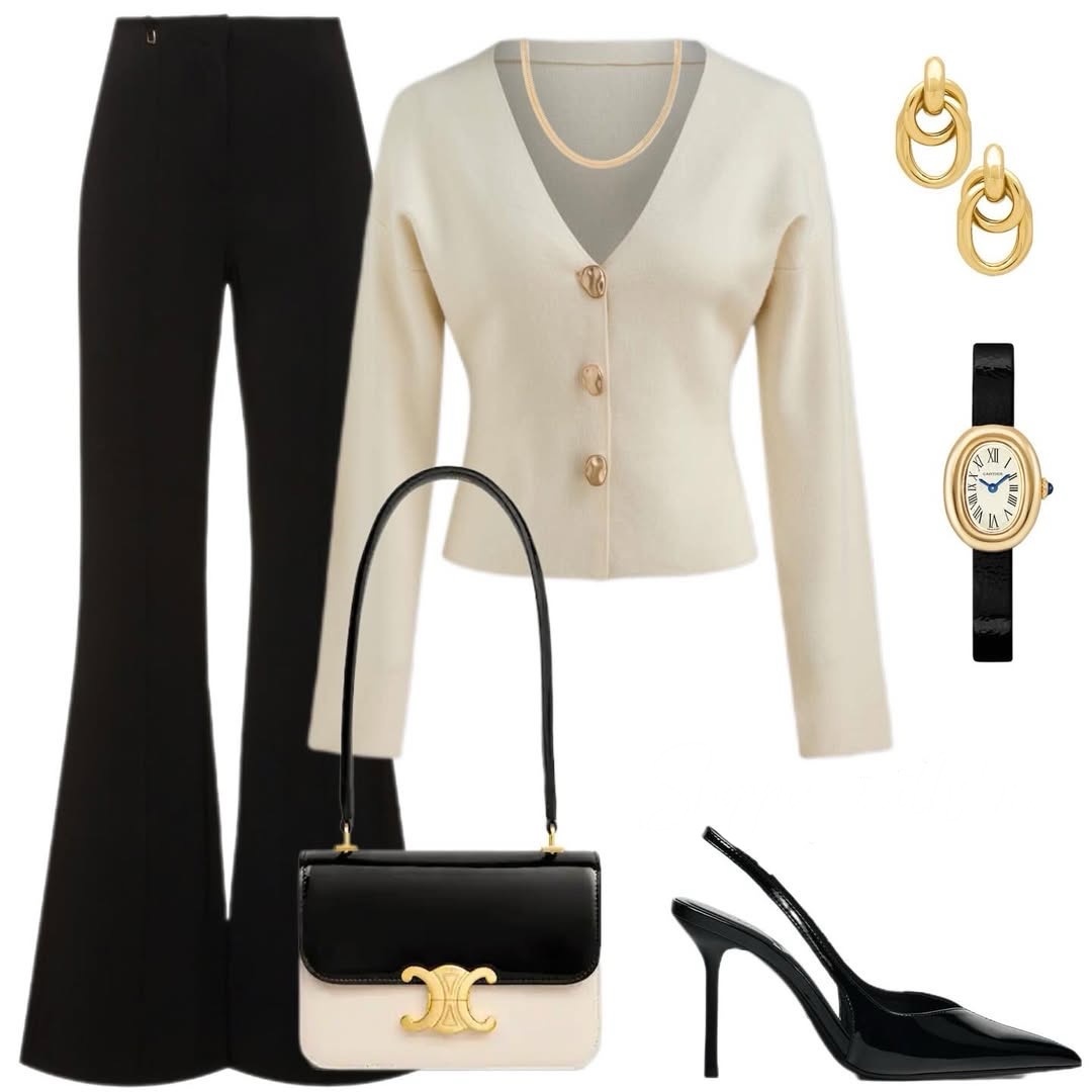 Герои: укороченный кардиган айвори на крупных пуговицах, тонкий топ/майка-слой, брюки с высокой посадкой и лёгким клёшем от колена, багет-сумка чёрно-молочная с золотой пряжкой, лаковые лодочки slingback, серьги-кольца и часы на узком ремешке.