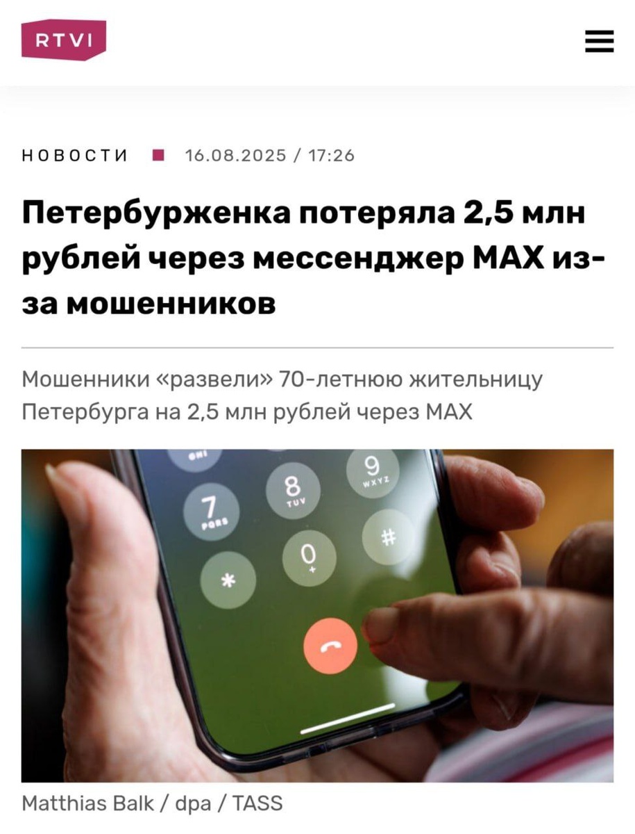 Мошенники через MAX украли у пенсионерки 2,5 миллиона рублей — старушка поверила «сотрудникам» Росфинансов и ФСБ. Аферисты обманом убедили бабушку установить национальный мессенджер MAX — якобы нужно срочно задеклалировать сбережения. В нём с женщиной связался «сотрудник ФСБ» и заставил передать все деньги курьерам. Теперь полицейские разыскивают разработчиков MAX курьеров и самих аферистов.